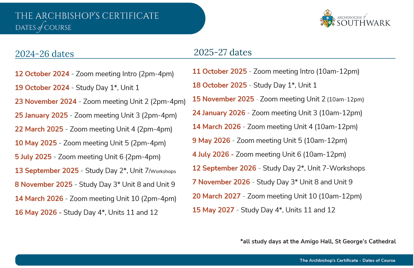 The Archbishop’s Certificate is the principal training course in the Archdiocese of Southwark whose aim is to equip and support catechists and lay leaders in evangelisation and formation.